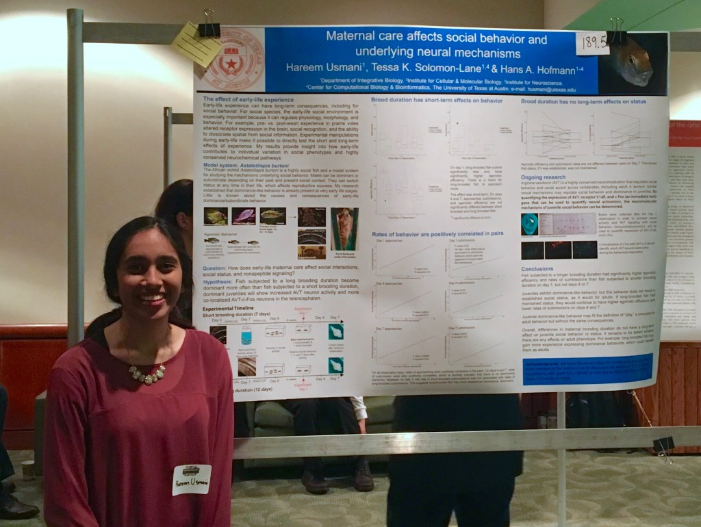 Go see graduate student Becca Butler present her poster “The Development of Social Status in a Highly Social Fish” (P1-161) at the Society for Integrative and Comparative Biology meeting in Tampa! Becca completed this work as an undergraduate researcher with me in the Hofmann Lab. While juvenile social behavior is quite similar to adults, and they can form status relationships, we show that the social “rules” differ from the adults. Becca also mastered intracerebroventricular injections and was able to alter social status by manipulating arginine vasotocin signaling.