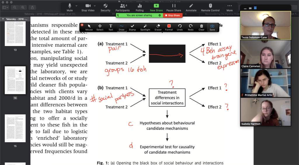 It’s our second summer in the Lab! Emily, Claire, and Bela worked virtually to analyze social behavior data collected by Emily and recent graduate Caity, as a part of her thesis, in Fall 2019. We spent time collaborating (see image: apparently puzzled?) on Zoom and working independently to accomplish a lot! The Lab community has been invaluable during this phase of the Covid-19 pandemic.
