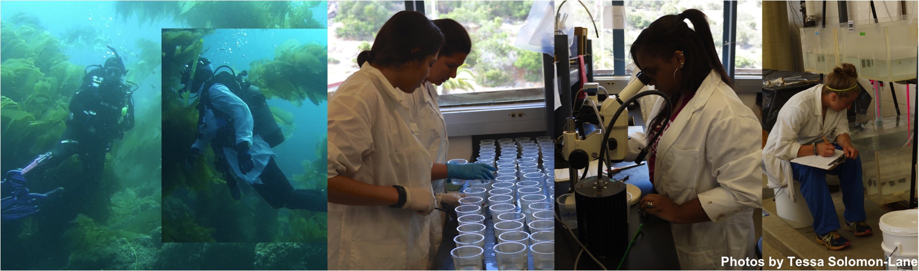Catalina Field Crew 2014: (Left to right) Megan and me diving at Catalina Island, CA; Alma and Megan forming bluebanded goby social groups; Cierra process gobies for social groups; Alyssa observing social behavior.