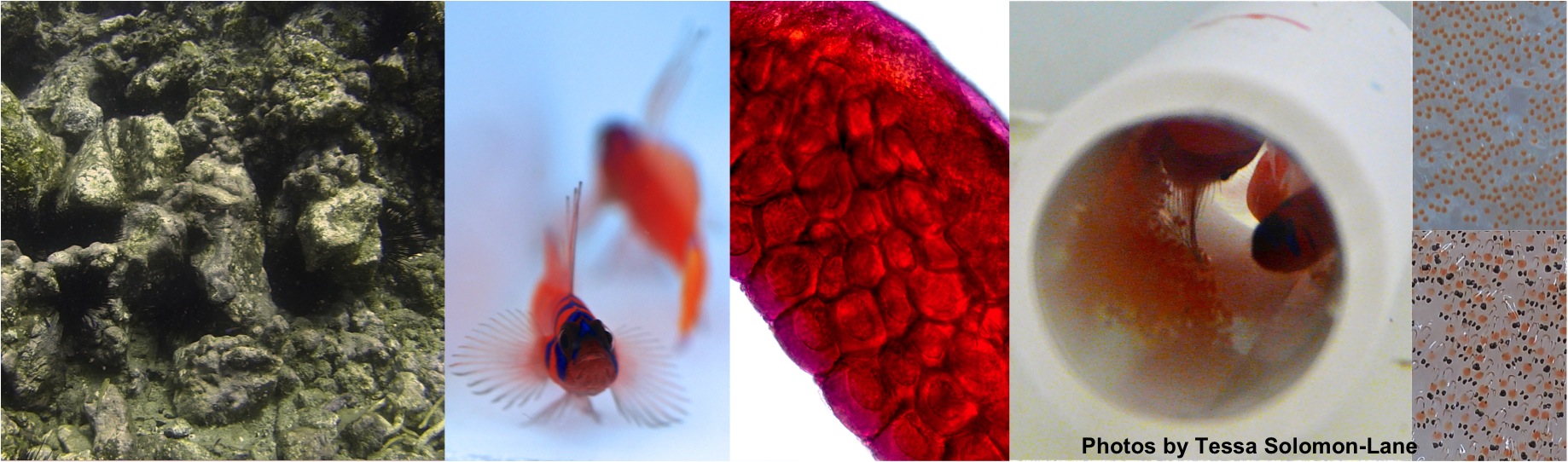 (Left to right) Bluebanded goby habitat on Catalina Island, CA rocky reefs; gobies in the lab; juvenile gonad with developing eggs and sperm; male and female spawning in the lab; newly laid (top) and eyed eggs (bottom).
