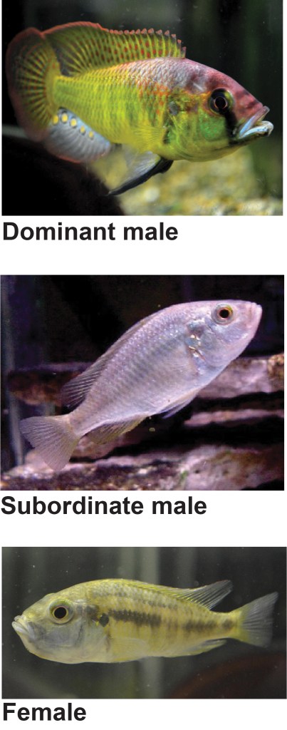 A. burtoni is a highly social cichlid fish that is native to Lake Tanganyika, the largest of the East African Rift lakes. Cichlid fish are well known for their massive adaptive radiation – there are at least 2,000 different species! Cichlid species differ in their behavior, morphology, and ecological niche. Species also vary in their social and reproductive systems. For example, A. burtoni exhibit maternal care, while other species have paternal care, biparental care, polygamous harems with helpers, or monogamous pairs with helpers.
